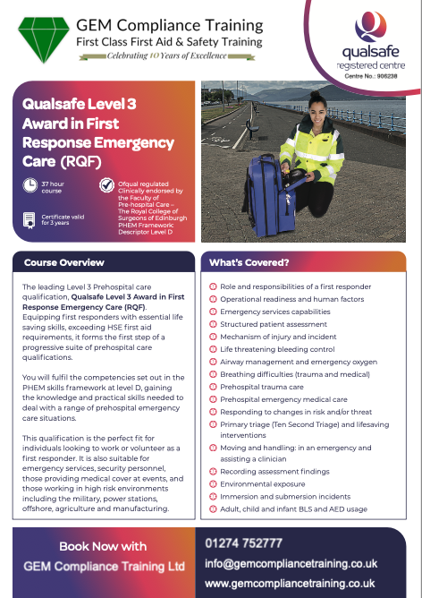 • Teaches advanced first aid skills for higher-risk environments, including patient assessment, trauma management, catastrophic bleeding, airway care and medical emergencies. | • Ideal for security staff, event medics, close protection, high-risk workplaces and anyone needing a qualification above First Aid at Work. | • A strong progression route for those aiming to work in pre-hospital care roles.